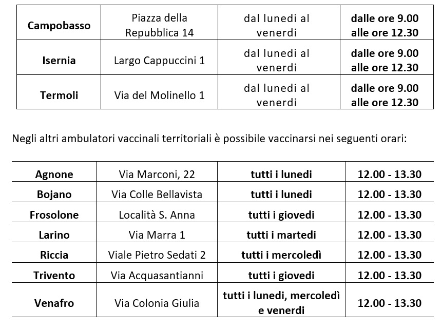 Inoltre, per dare la possibilità ai soggetti disabili, allettati o fragili intrasportabili, residenti o domiciliati nella Regione Molise, di poter effettuare la vaccinazione a domicilio, i caregivers possono inviare una richiesta all’indirizzo mail “dipartimentounicoprevenzione@asrem.molise.it “, specificando il tipo di vaccinazione richiesta (antinfluenzale, antiCovid-19, antipneumococcica), i dati anagrafici, l’indirizzo ed il recapito telefonico, a cui saranno chiamati per pianificare la vaccinoprofilassi.