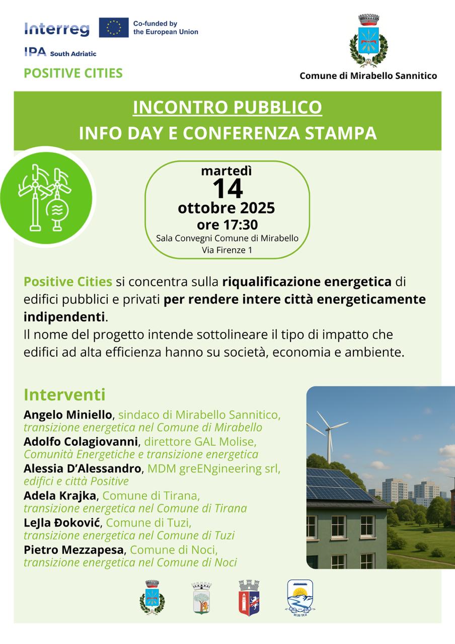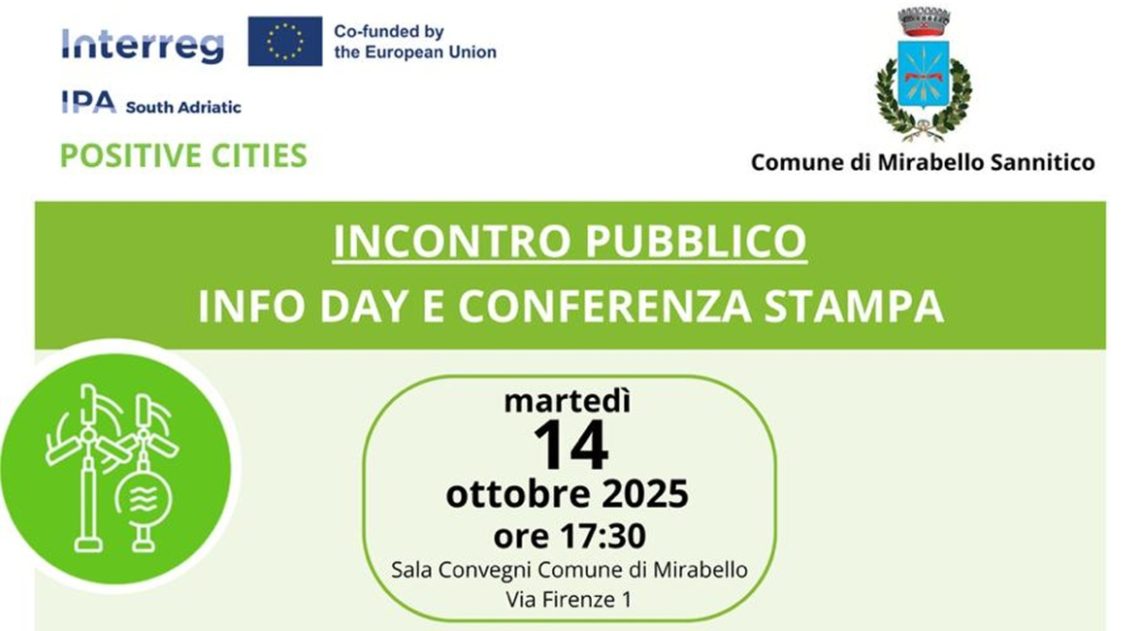 Il Comune di Mirabello Sannitico, in qualità di capofila del progetto “POSITIVE CITIES” co finanziato dal programma Interreg South Adriatic, è lieto di annunciare la conferenza di lancio e la giornata informativa che si terranno il 14 ottobre alle ore 17:30, presso la sala convegni comunale.