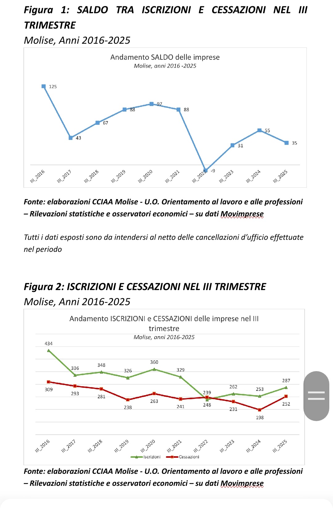 Il tessuto imprenditoriale molisano continua a mostrare segnali di tenuta. Nel terzo trimestre del 2025, il saldo tra iscrizioni e cessazioni di imprese si chiude con 35 attività in più, in continuità con i mesi precedenti e in linea con il trend nazionale. Un risultato che, pur inferiore a quello registrato nello stesso periodo del 2024 (+55), conferma la resilienza del sistema produttivo regionale, sostenuto da una buona dinamica di nuove aperture.