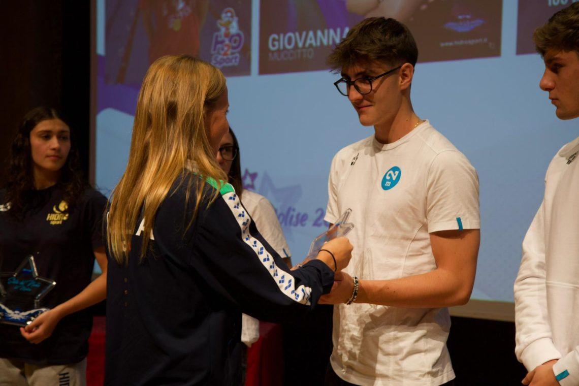 Ma tante sono state le Stelle consegnate ieri sera sul palco dell’Auditorium della ex Gil di Campobasso. Premiate le società Sportive, Hidro Sport che quest’anno festeggia per 20 anni di attività, Emmedue, ’H2O Sport, che con il loro impegno e professionalità quotidiane hanno anche nella passata stagione partecipato con un numero sempre più crescente di atleti ai Campionati Tricolori. E ancora Stelle alle società Scuola Nuoto Isernia, Fabbrica del Nuoto, Termoli Nuoto per l’impegno nella divulgazione e promozionale delle discipline acquatiche. E ancora sul palco a ritirare le meritate Stelle gli atleti che hanno partecipato ai Campionati Italiani Giovanili, di Categoria, ai Campionati Italiani di fondo e a quelli di Salvamento: Lomastro Alice, Di Ridolfo Miriam, Muccitto Giovanna, Orrino Beatrice, Ziccardi Marta, Fiardi Maria, Orrino Sofia, Colalillo Sara, Spedalieri Ester, Giamberardino Christian, Gasbarrino Michele, La Barbera Daniele, Tedeschi Ermanno, Notardonato Martina, Bellucci Francesca, Marra Francesco, Fasciano Francesco, Catelli Alessandro, Palladino Alice (Hidro Sport), Alessio D’Agostino, Giuseppe Cantalupo, Di Frangia Cristiana, Sarra Alessandra, Luigi Pallante (m2), Peluso Eleonora (Swim Academy), Silvaroli Sofia, Cavina Sofia, Angelicola Alessia, Menna Ilario, Aiello Lorenzo, Visan Lorena, Santorelli Nicole, De Lena Iacopo, Zitti Umberto Antonio, Alfieri Armando, Marzola Jacopo, Angelilli Luca, Florio Emanuele , Gabriele Andrea, Michele Giampietro quest’ultimo per la medaglia d’argento di categoria conquistata nell’avvincente traversata del Bosforo (H2O Sport).