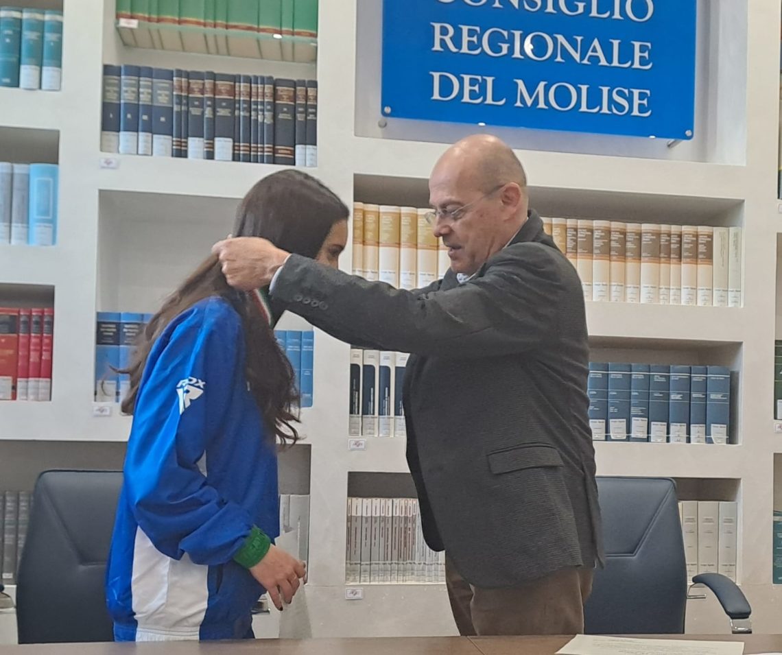 Analoga onorificenza è stata consegnata anche al coach Carmine De Palma per l’impegno profuso nell’allenare la giovane molisana, tanto da consentirle di raggiungere diversi traguardi prestigiosi nel mondo dello sport.