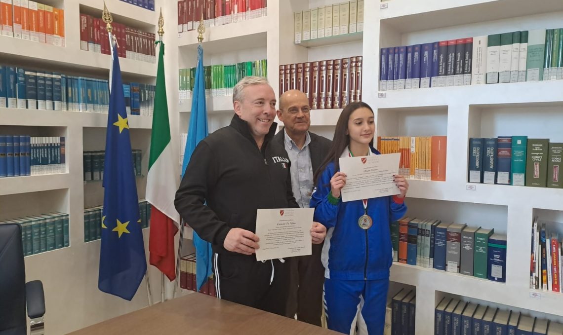 Analoga onorificenza è stata consegnata anche al coach Carmine De Palma per l’impegno profuso nell’allenare la giovane molisana, tanto da consentirle di raggiungere diversi traguardi prestigiosi nel mondo dello sport.