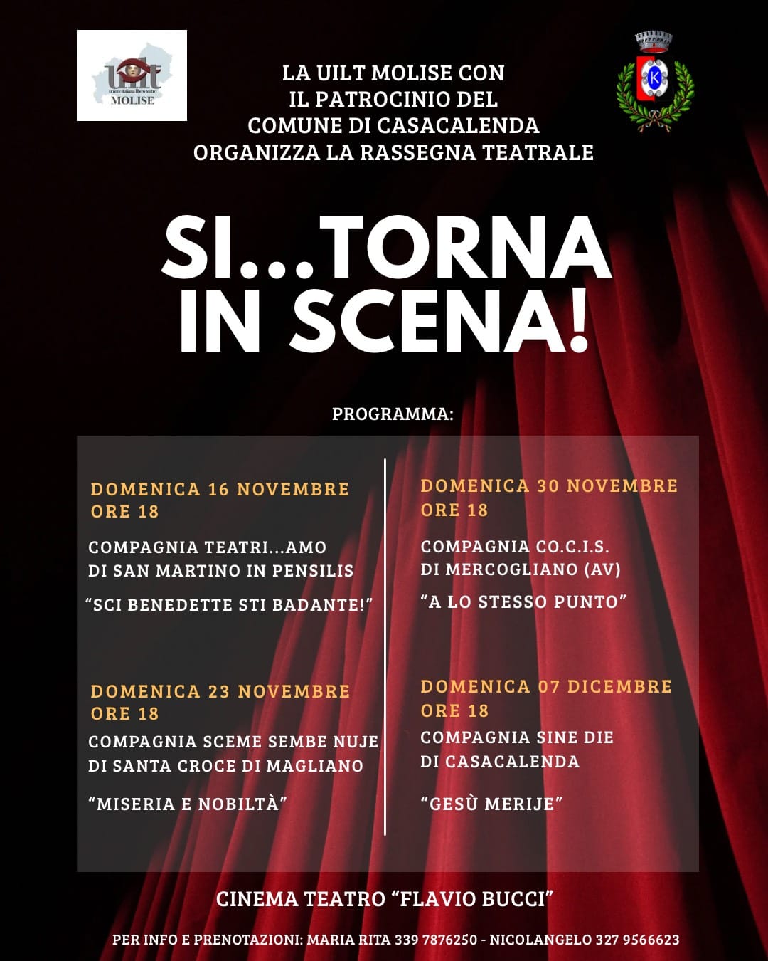 Torna sul palcoscenico del Cinema Teatro “Flavio Bucci” la rassegna teatrale “SI…TORNA IN SCENA!”, organizzata dalla UILT Molise con il patrocinio del Comune di Casacalenda. Quattro domeniche all’insegna della cultura, dell’arte e della passione teatrale da metà novembre fino ai primi di dicembre.