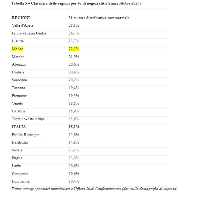 Secondo le stime di Confcommercio, la regione Molise presenta un quadro particolarmente delicato per quanto riguarda il tasso di sfitto dei locali commerciali: pari a circa 947 negozi sfitti (stima ottobre 2025). Nonostante il valore assoluto sia tra i più bassi a livello nazionale a causa della minore estensione territoriale, il dato percentuale evidenzia una situazione critica.