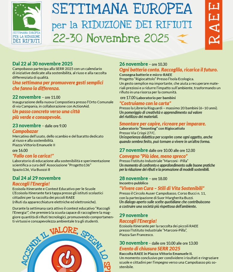 Ogni anno, a fine novembre, l’Europa dedica una settimana a riflettere su come ridurre ciò che buttiamo via. La Settimana Europea per la Riduzione dei Rifiuti (SERR) torna anche nel 2025 con un tema preciso e sempre più urgente: i RAEE, i rifiuti elettrici ed elettronici. Telefoni, caricabatterie, batterie, piccoli dispositivi domestici, tutti oggetti che accompagnano la nostra quotidianità e che troppo spesso restano dimenticati nei cassetti oppure vengono smaltiti in modo scorretto. Campobasso risponde a questa sfida con un programma ampio, diffuso e pensato per coinvolgere tutta la città. Una settimana che porta il tema dei RAEE nei luoghi della quotidianità: nelle scuole, nelle piazze, nei quartieri, attraverso attività educative, momenti di sensibilizzazione, laboratori creativi, azioni di raccolta e iniziative dedicate al riuso.