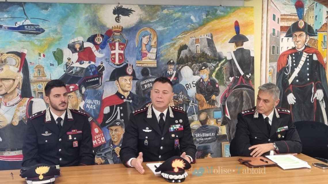 I dettagli dell’operazione sono stati illistrati questa mattina presso il Comando provinciale dei Carabinieri di Campobasso dal Comandante provinciale, Luigi Di Santo, dal Comandante del Nor di Larino, Alfredo Zarella, dal Comandante della Compagnia di Larino Vincenzo Bazzurri, dal Procuratore della Repubblica presso il Tribunale di Larino, Elvira Antonelli, e dal Sostituto Procuratore Marianna Meo.
