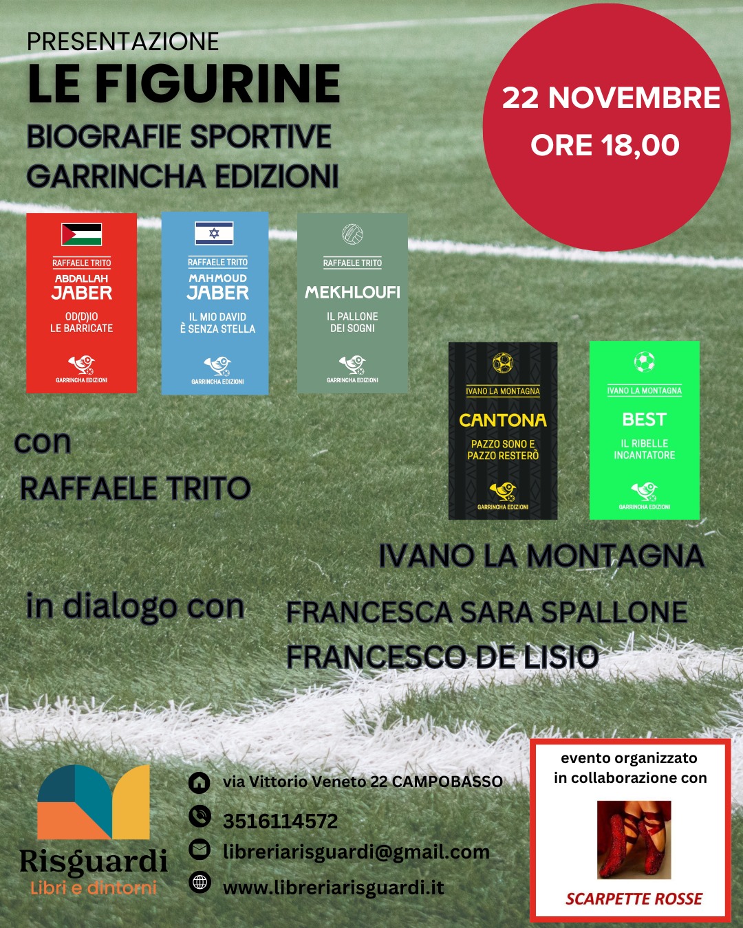 Sabato 22 novembre alle ore 18, presso la libreria RISGUARDI in via Veneto 22 a Campobasso, si terrà la presentazione di cinque volumi della collana “Le Figurine” delle edizioni Garrincha (Marotta&Cafiero), un progetto editoriale che celebra le storie uniche e appassionanti di calciatori che hanno lasciato un segno indelebile nella storia dello sport e nella società.