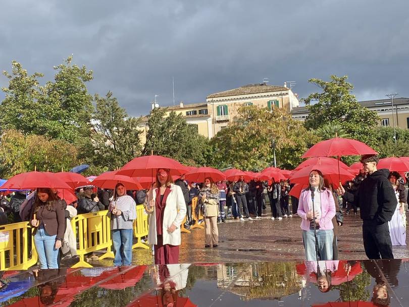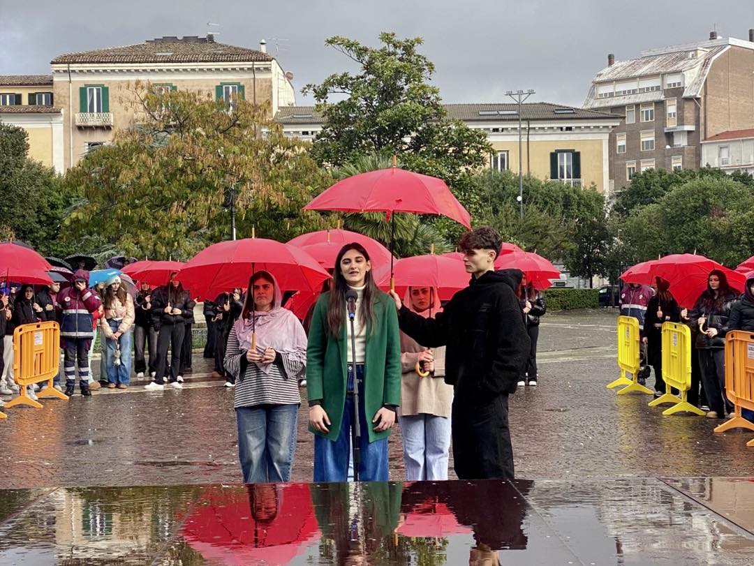 In una piazza Vittorio Emanuele II avvolta dalla pioggia, la loro performance ha attraversato il silenzio con parole, gesti e sguardi che hanno commosso e fatto riflettere. A rendere ancora più potente il messaggio, una distesa di ombrelli rossi, indossati da ragazze e ragazzi come scudi contro l’indifferenza. Una macchia rossa, viva, vibrante, che ha colorato il grigio del cielo e ricordato a tutti che il rosso è il colore del femminicidio, il colore del sangue, ma anche della forza e della resistenza.