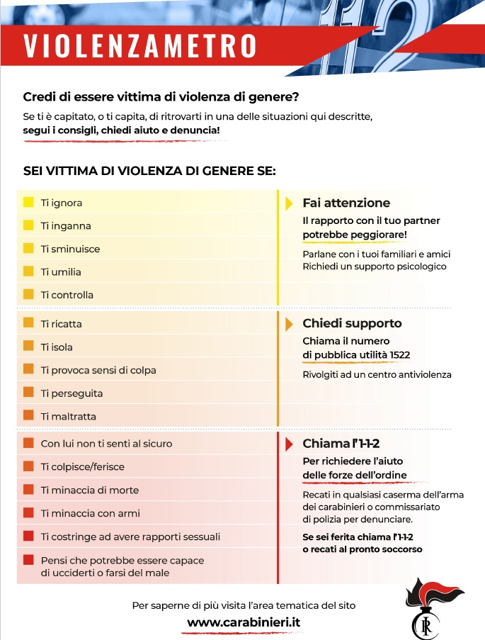 Inoltre, sul sito www.carabinieri.it, è stata dedicata un’intera sezione al “Codice Rosso”, che offre informazioni sul fenomeno e sugli strumenti di tutela delle vittime, mettendo a disposizione un test di autovalutazione, denominato “Violenzametro” (a fine articolo), che rileva il livello di violenza subita in un rapporto di coppia (http://www.carabinieri.it/in-vostro-aiuto/consigli/codice-rosso/codice-rosso).