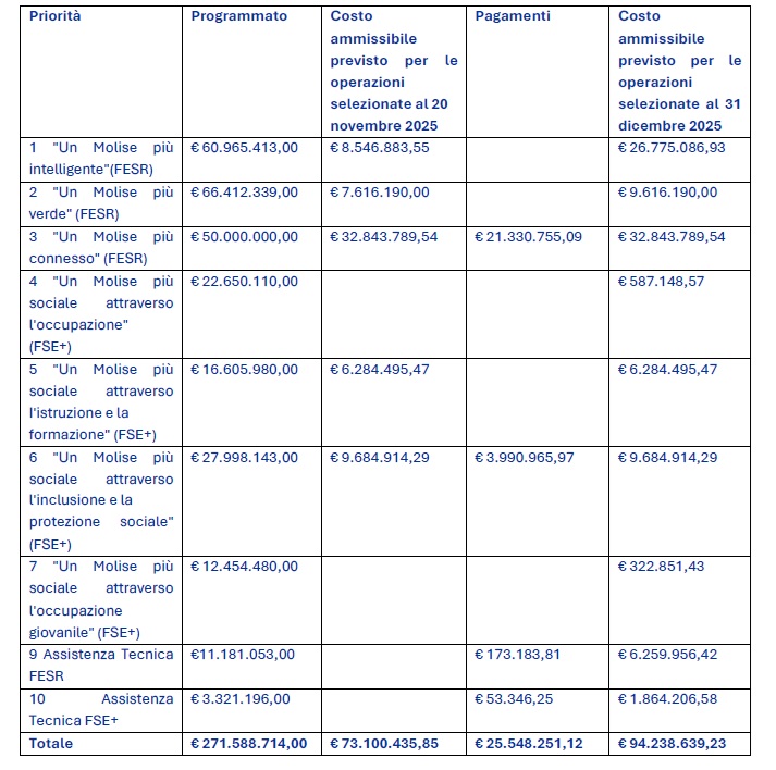 Con una dotazione complessiva di 383,3 milioni di euro, di cui oltre 300 milioni FESR e più di 83 milioni FSE+, il Programma Regionale è oggi uno strumento potente che il Molise sta finalmente iniziando a utilizzare in modo pieno e strategico. I numeri parlano chiaro: