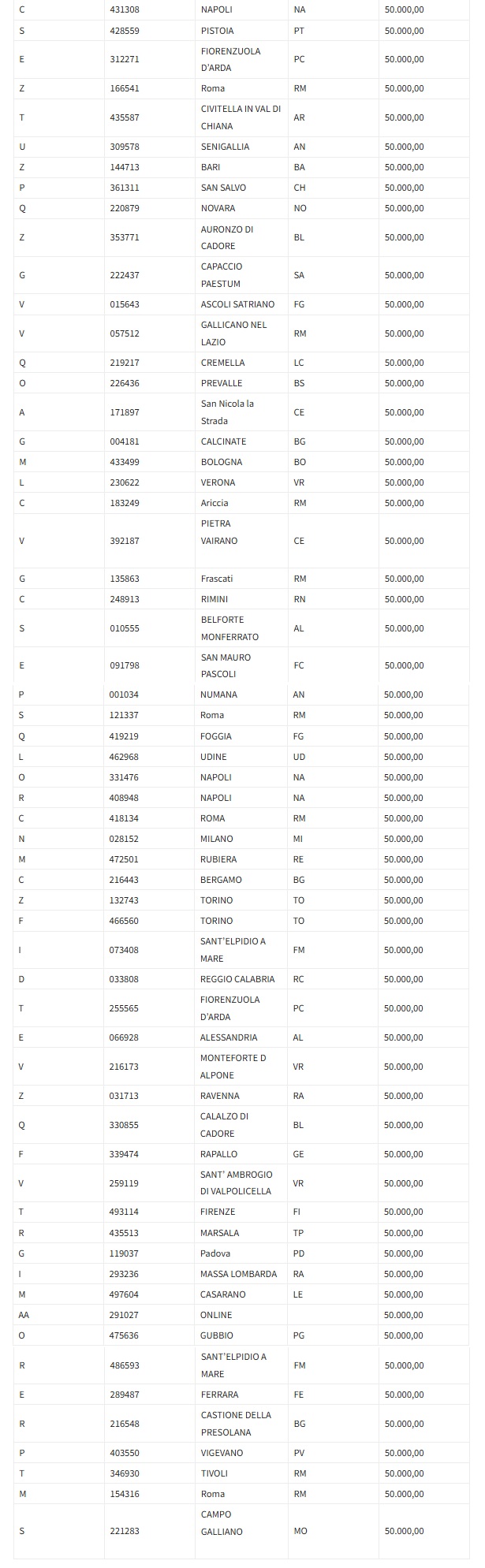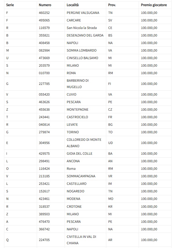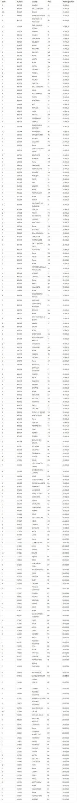 Quinto premio, valore 1 milione di euro: biglietto numero di serie Q331024 venduto ad Albano Laziale, corso Matteotti Giacomo 12