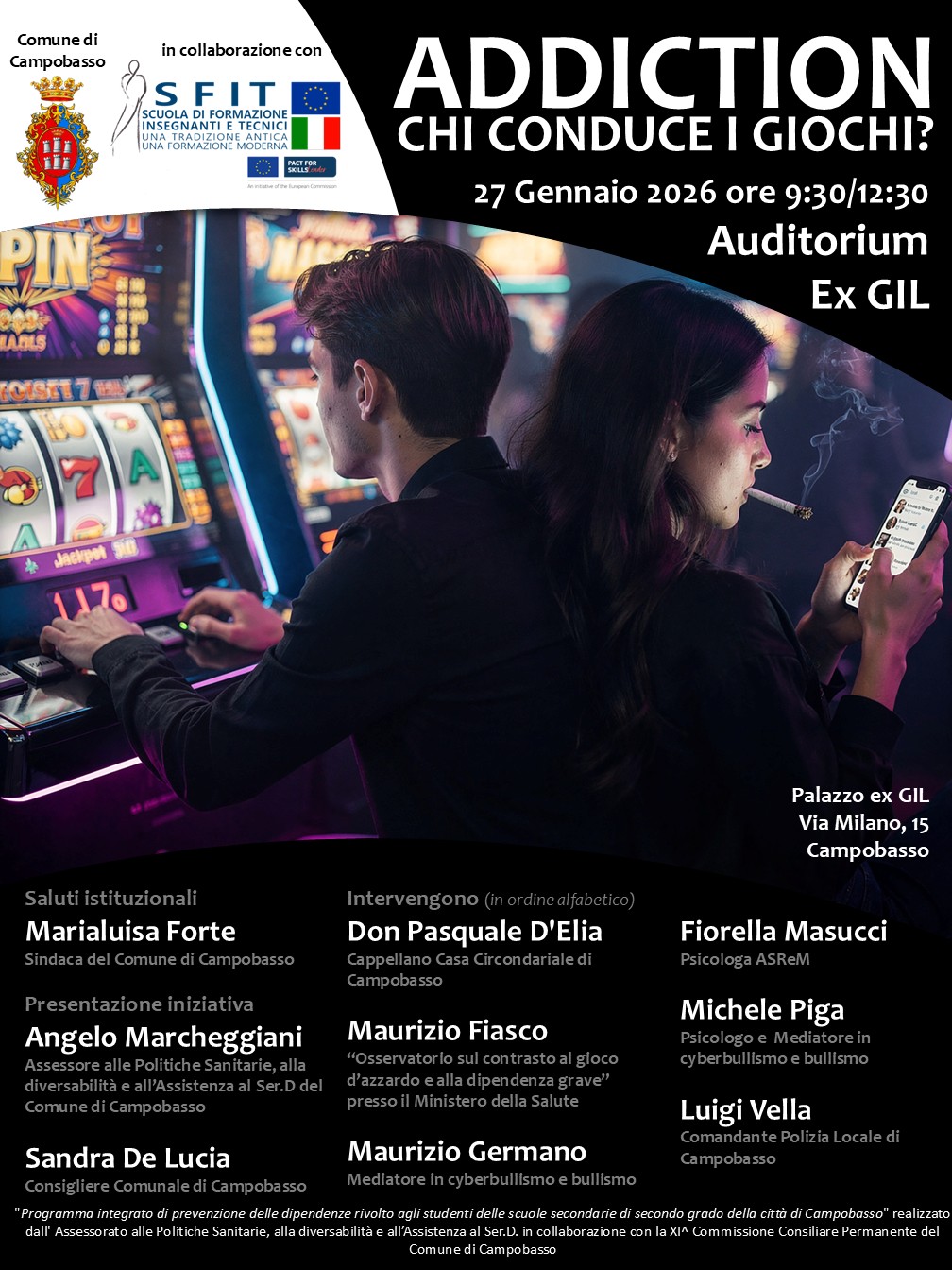 Si terrà martedì 27 gennaio 2026, dalle ore 9:30 alle 12:30, presso l’Auditorium ex Gil di Campobasso, l’incontro “Addiction – Chi conduce i giochi?”, primo appuntamento del “Programma integrato di prevenzione delle dipendenze patologiche rivolto agli studenti delle scuole secondarie di secondo grado della città”.