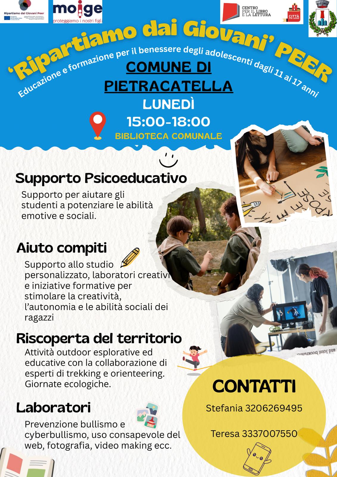 Promuovere il benessere degli adolescenti, prevenire il disagio giovanile e rafforzare competenze emotive, relazionali e sociali: sono questi gli obiettivi del progetto “Ripartiamo dai giovani peer”, che prenderà il via sul territorio di Pietracatella e dell’Ambito Territoriale Sociale di Riccia/Bojano da gennaio a luglio 2026.