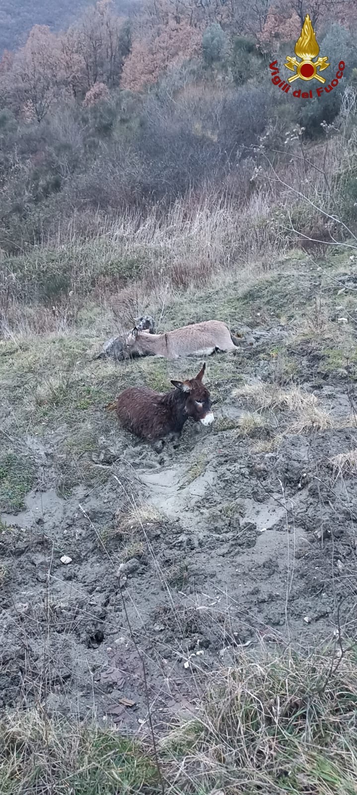 Giunti sul posto, i Vigili del Fuoco hanno riscontrato che gli animali erano vivi ma privi di forze, impossibilitati a muoversi autonomamente a causa del fango e delle difficili condizioni del terreno, particolarmente impervio e intriso d’acqua.