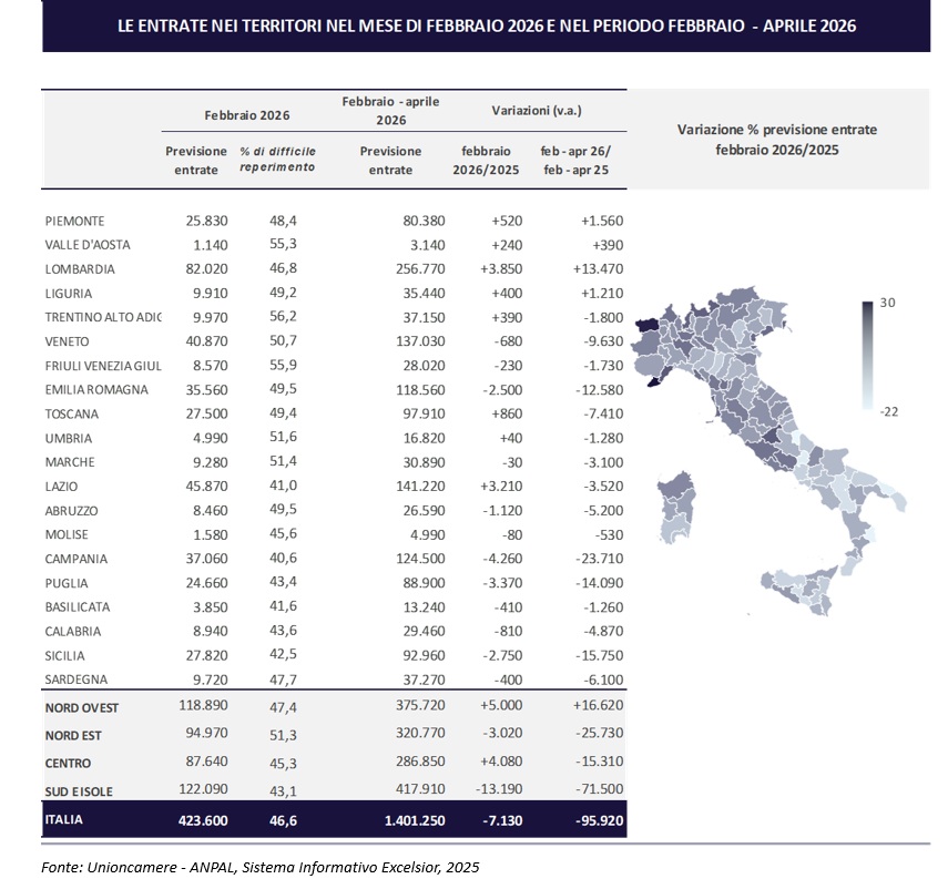 Le imprese Molisane programmano circa 1.600 entrate per febbraio 2026, con una proiezione di poco meno di 5mila contratti nel trimestre febbraio-aprile. La domanda di lavoro resta stabile, ma quasi una posizione su due risulta di difficile copertura.