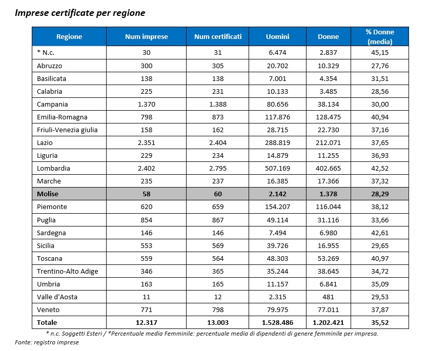 Nel Molise risultano 58 imprese certificate, per un totale di 60 certificazioni, che coinvolgono 3.520 lavoratori, di cui 1.378 donne. La quota media di occupazione femminile nelle imprese certificate regionali si attesta al 28,29%, uno dei valori più bassi nel confronto nazionale; solo l’Abruzzo registra una percentuale leggermente inferiore (27,76%)-