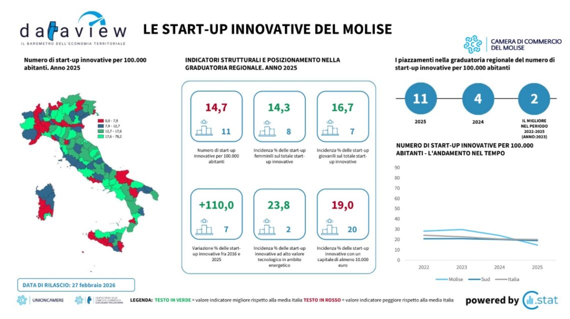 Nel 2025 il Molise registra 14,7 start-up innovative ogni 100.000 abitanti, collocandosi all’11° posto nella graduatoria nazionale. Il dato segna un arretramento rispetto al 4° posto del 2024 e al miglior piazzamento raggiunto nel 2023 (2° posto), evidenziando una fase di rallentamento relativo nel confronto con le altre regioni.