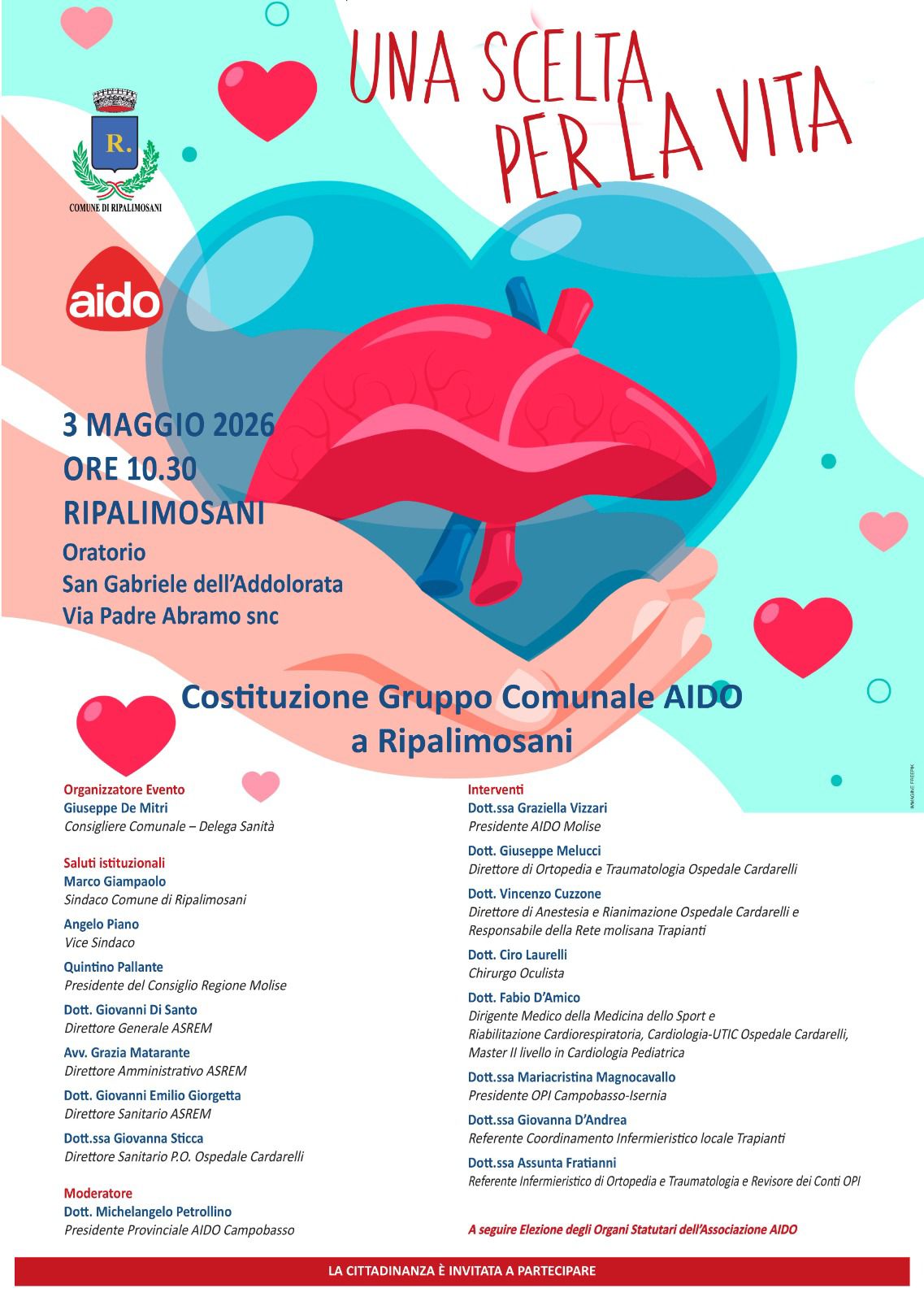Domenica 3 maggio 2026, alle ore 10:30, presso l’Oratorio San Gabriele dell’Addolorata (Via Padre Abramo snc), si terrà l’evento ufficiale per la Costituzione del Gruppo Comunale AIDO (Associazione Italiana per la Donazione di Organi, Tessuti e Cellule) a Ripalimosani.